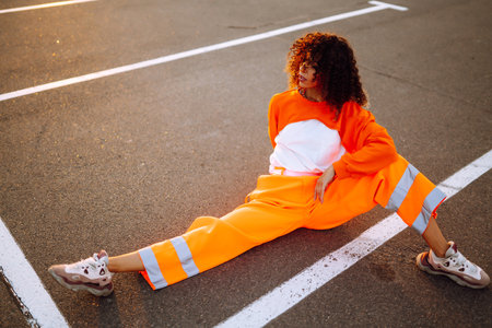 Young African American woman - dancer dancing in the street at sunset. Stylish woman with curly hair in an orange suit showing some moves.
