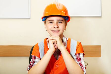 beautiful woman builder in a protective helmet and orange vest with scissors in her hands, light background