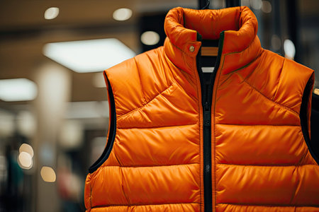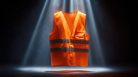 A high-visibility orange safety vest featuring reflective stripes is showcased under dramatic lighting, emphasizing its importance in safety and protection.