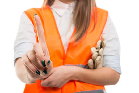 Closeup of girl engineer finger pressing the futuristic screen as concept of construction and maintenance