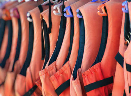 Close-up of an orange life jacket and lifebuoy on a wooden surface, highlighting their importance in emergency situations and water safety.