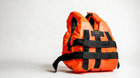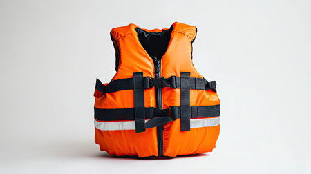 Minimalist photo of a life jacket on a white backdrop, highlighting its safety features and design for effective flotation and visibility