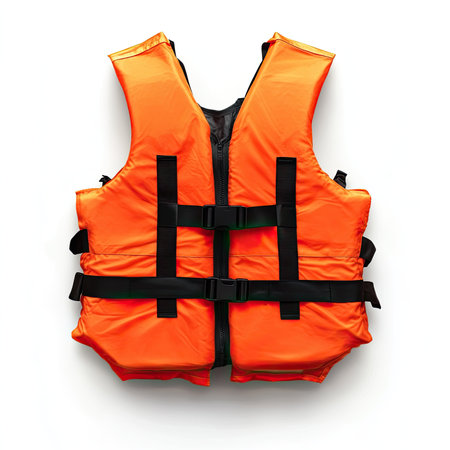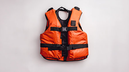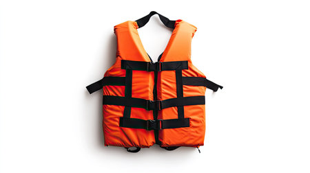 Life jacket on a white background, emphasizing its high-visibility color and secure straps. Key gear for ensuring safety during aquatic activities.