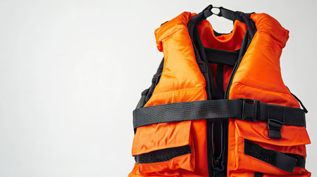 orange life jacket against a white backdrop, showcasing vital safety equipment for boating and swimming. Perfect for child safety.