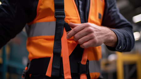 A closeup image of hands adjusting safety equipment with the help of an AR overlay that provides stepbystep assembly instructions emphasizing proper setup for safety