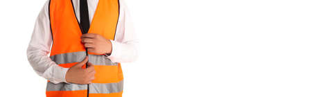 Cropped view of engineer wearing safety vest isolated on white, banner