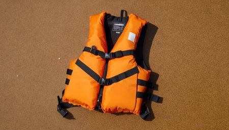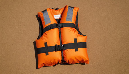 A bright orange life jacket is displayed on a solid background, emphasizing the importance of water safety. Perfect for promotional use in aquatic activities.