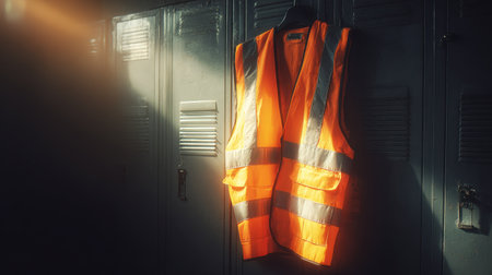 A bright orange safety vest is prominently displayed in a locker room, emphasizing the importance of safety attire in industrial and construction settings.
