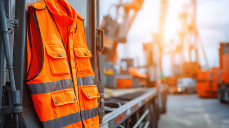 A bright orange safety vest displayed on industrial equipment symbolizes safety and visibility in the construction industry, surrounded by cranes and trucks.