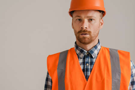 White man worker wearing helmet and vest looking at camera isolated over grey background
