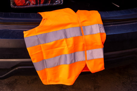 An orange reflective vest stored in the trunk of a car. Roadside emergency preparedness and road trip planning. Travel essentials