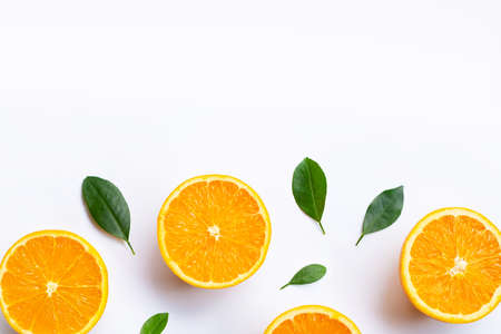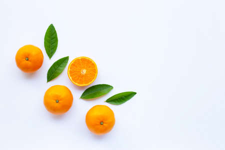 High vitamin C, Juicy and sweet. Fresh orange fruit with green leaves on white background