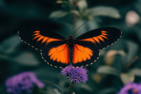 A vibrant orange and black butterfly perched on purple asters, with blurred greenery in the background. --ar 3:2 --v 6.1 Job ID: 7bc4c483-afa1-4d6c-9a91-13e92ffa76a8