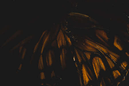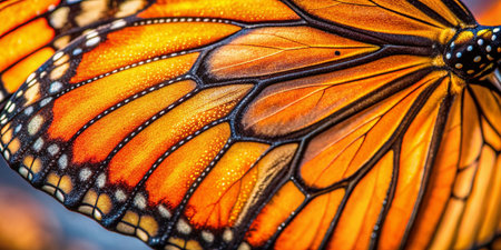 Vibrant orange and black veins pattern on delicate intricately scaled wing of a monarch butterfly, showcasing minute details and subtle sheen in natural light.