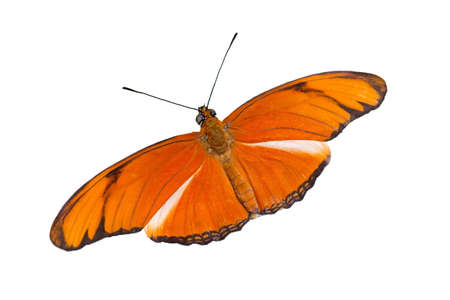 This image features a close-up of a monarch butterfly with its wings spread, isolated against a white background. The butterfly displays its characteristic orange and black patterned wings, with visible details of its antennae and legs. The white background provides a stark contrast, highlighting the intricate details of the butterfly's wings and body.