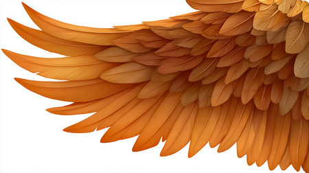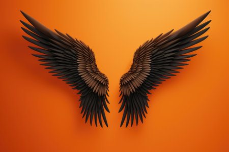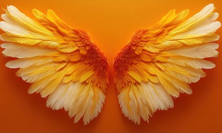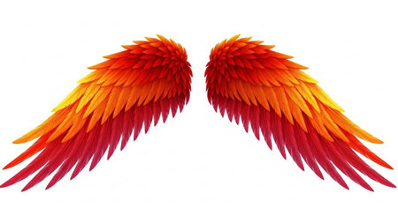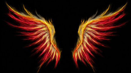 An artistic design features two symmetrical wings, displaying vibrant gradients of red, orange, and yellow hues. Set against a stark black backdrop, the illustration showcases detailed feather textures. This image is suitable for various creative applications, including design projects and illustrative uses.