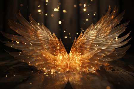 Glowing golden angel wings composed of shimmering light particles, radiating warmth and energy against a dark background. The ethereal glow creates a celestial and magical atmosphere.