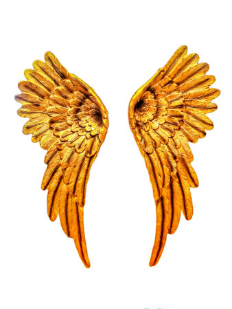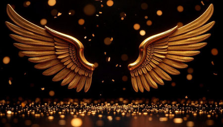 Stunning golden wings with detailed feather texture showcase beauty against a colorful sunset sky, creating a serene and ethereal atmosphere.