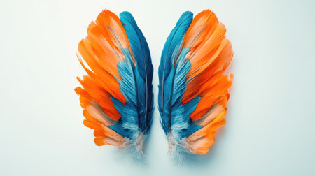 A minimalistic composition of orange and blue feathers, arranged to create a symmetrical and harmonious visual
