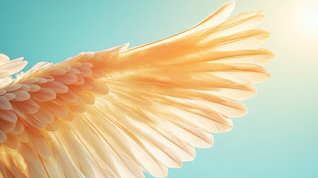 Close-up of intricate feather details on angel wings, with a bright, clear sky in the background