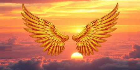 This stunning image features golden angel wings set against a dramatic sunset sky, creating a beautiful and serene atmosphere filled with warmth and inspiration.