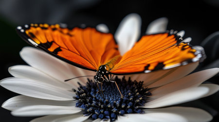 A brightly colored butterfly resting on a black-and-white flower uniqueness concept