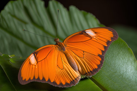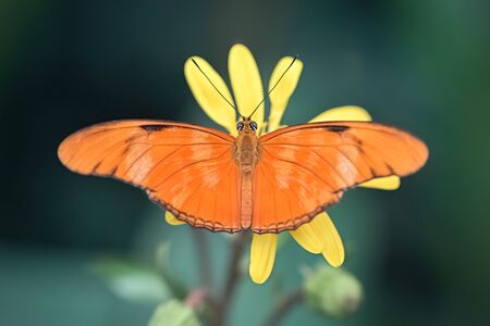 Julia butterfly in yellow flower (Dryas iulia). Close-up. Dark green background
