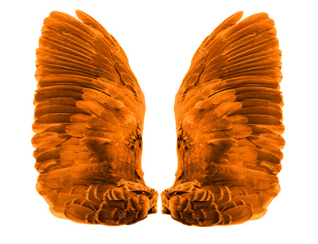 A close-up image of two bird wings, showcasing the intricate details of their orange and white feathers, set against a soft blue background.