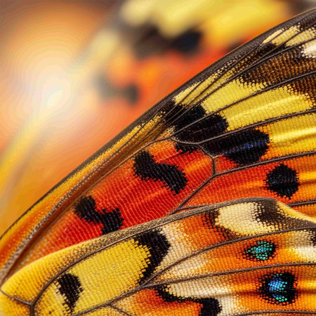 Detailed close-up of a butterfly wing showcasing vibrant colors and intricate patterns in natural light