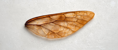 The wing of a dragonfly is shown in a close up. The wing is made of a thin, translucent material that is covered in tiny hairs. The wing is also covered in a pattern of veins that give it a delicate