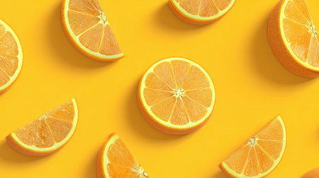 A stunning arrangement of orange slices on a bright yellow background brings a vibrant and fresh feel, ideal for concepts related to health and culinary art.
