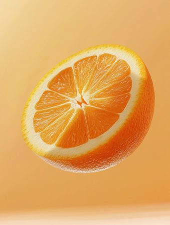 Half orange slice floating on orange background. Fresh ripe orange slice, close up. Citrus fruit, refreshment, juicy fruit, orange, healthy fruit. Summer dessert with copy space