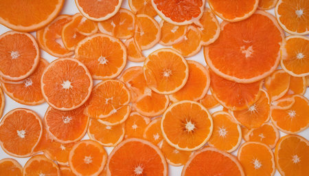 juicy sliced oranges or tangerines, top view background