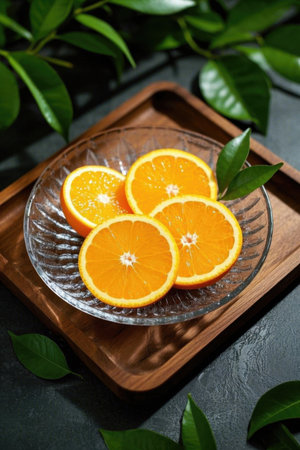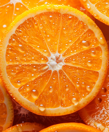 Delight in the beauty of fresh orange slices glistening in natural light, accentuating their vibrant color and healthy appeal. Perfect for food photography.