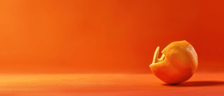 A partially eaten orange rests on a solid orange background. The orange is slightly tilted, with a small portion of the peel missing, revealing the white pith underneath.