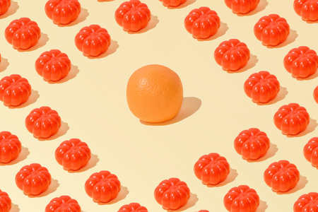 Creative summer abstract tomato and orange pattern flat lay on pastel yellow background minimalism