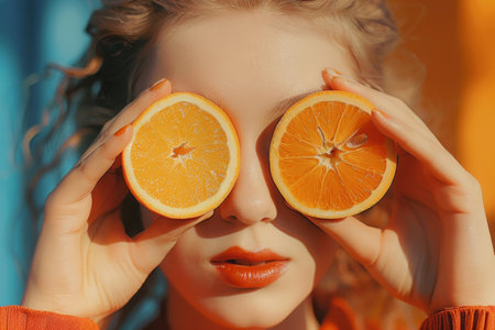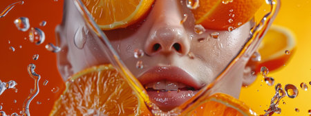 A close-up image of a face partially covered with orange slices and water splashes. The vibrant and refreshing composition is ideal for skincare, beauty, and citrus-themed visuals.