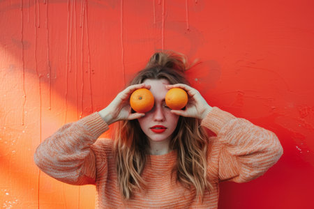 young woman covering her eyes while holding two oranges