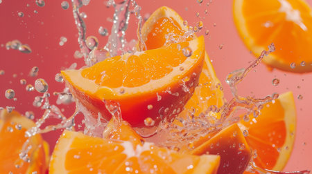 Dynamic close-up of orange slices splashing in water, set against a vibrant pink background, capturing the freshness and juiciness of citrus fruits.