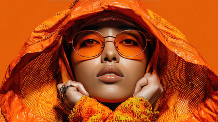 A fashionable woman showcases a stunning orange outfit complemented by bold accessories and striking makeup, embodying confidence and creativity.