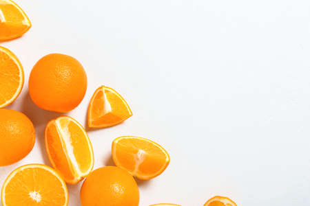 Close-up of fresh oranges, whole and halved on a white background with copy space, horizontal