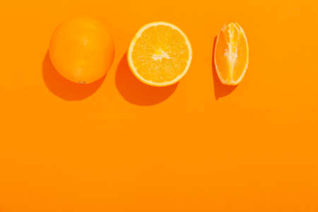 Orange fruit on orange background. Orange slice close up. Top view.