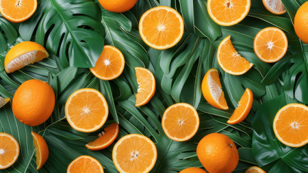 Creative fruits composition. Beautiful oranges whole and sliced glistering with dew water droplet. flat lay top view. seamless macro closeup. Ai generated.