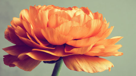 A close-up captures a fully bloomed orange flower, showcasing layered petals and delicate textures. The flower is set against a soft, muted background. The image, with its focus on natural beauty, could be used for various projects, including advertising or editorial content, emphasizing nature.