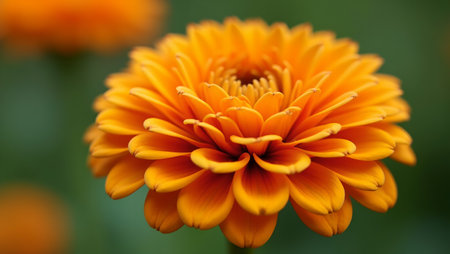 A vivid orange marigold flower in sharp focus, showcasing the intricate layers of petals and rich color, with a subtle background blur.