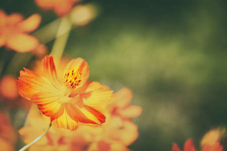 Beautiful Yellow Cosmos (Cosmos sulphureus) flowers blooming in the garden, closeup. Natural green background with copy space.