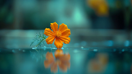Single Vibrant Orange Cosmos Flower, Reflected on Water with Ripples, Isolated Serenity.