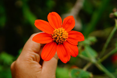 A closeup shot of a hand holding a Tithonia flower