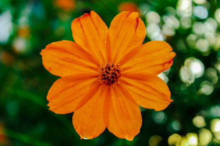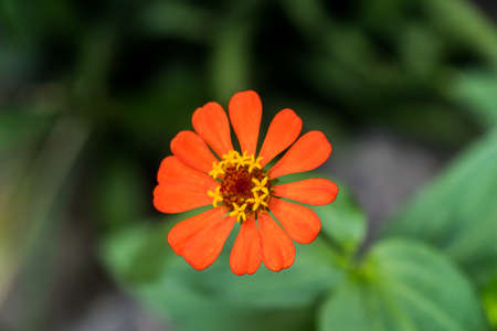 Orange flower closeup, single Zinnia flower in the garden, top view