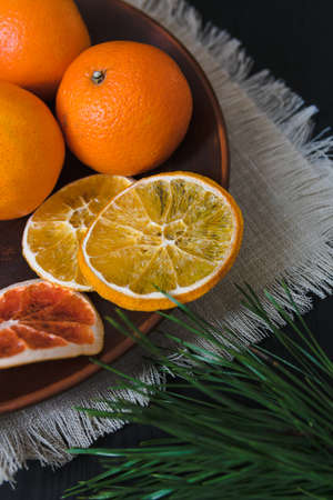 Fresh tangerines and dried slices on a clay plate on a dark background and a branch of spruce. Festive New Year concept. Citrus decor. Postcard. Close-up.